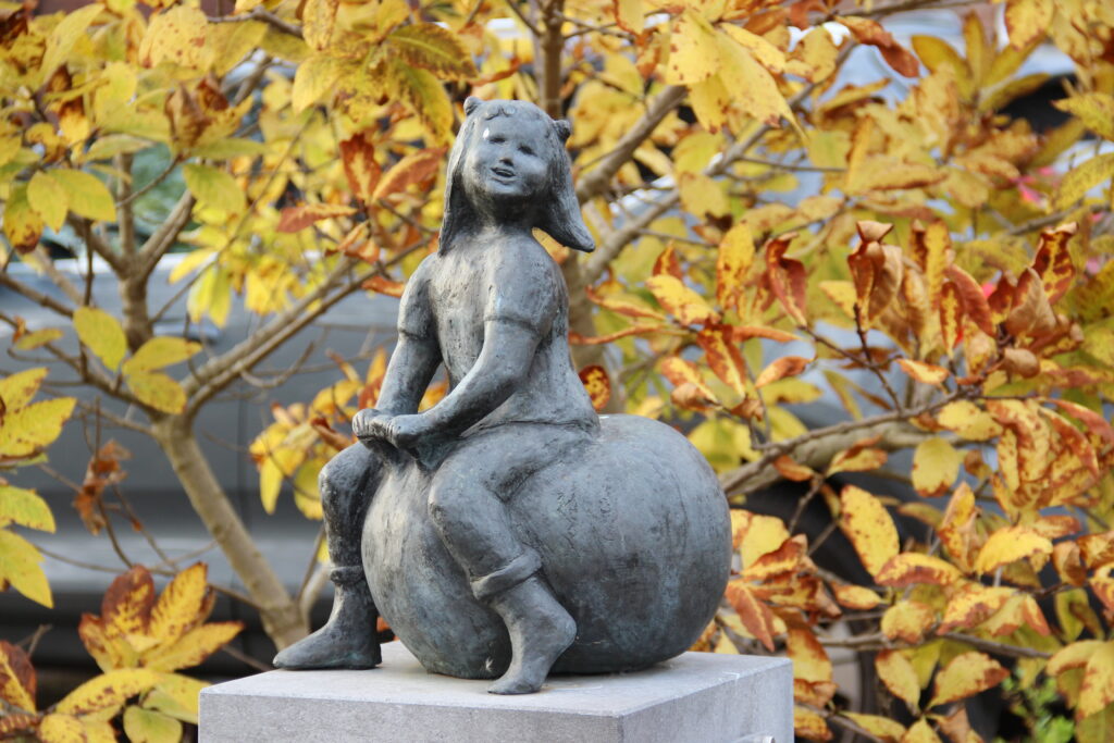 Blij meisje op skippybal, een beeld van Joke Luxemburg